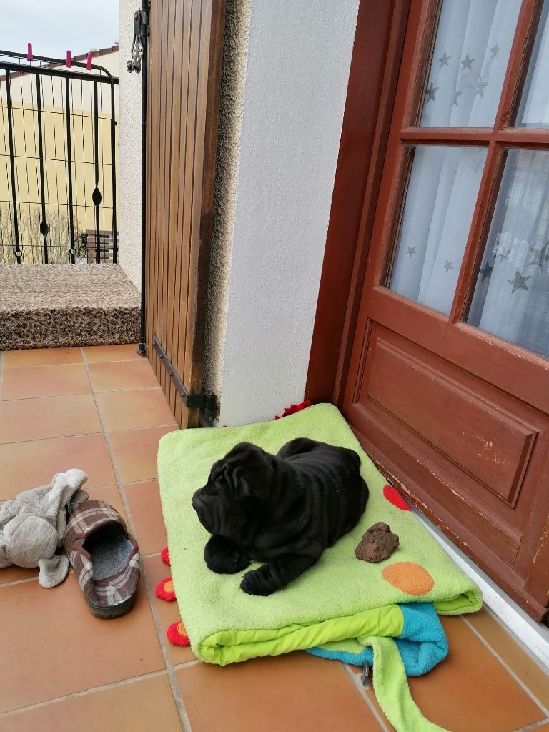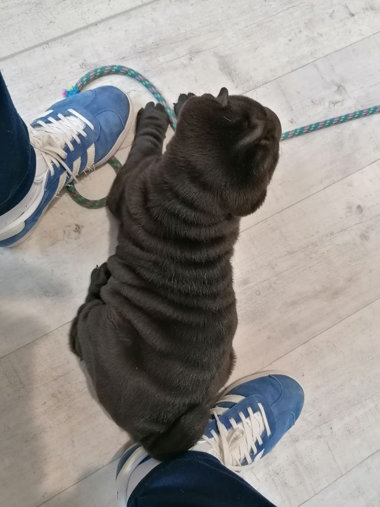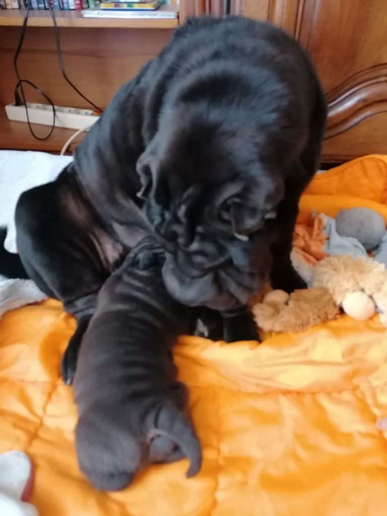 Bonjour, je vous présente le petit mâle de Perle. Il est de couleur noire comme sa maman. Il a juste 64 jours, ce mercredi 28 avril . Il s'appelle Socrate. C'est un beau bébé Shar-peï tranquille et brush brush coat.